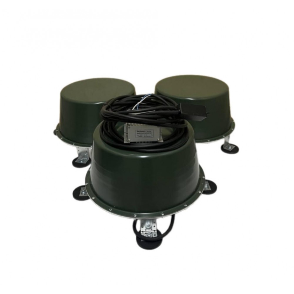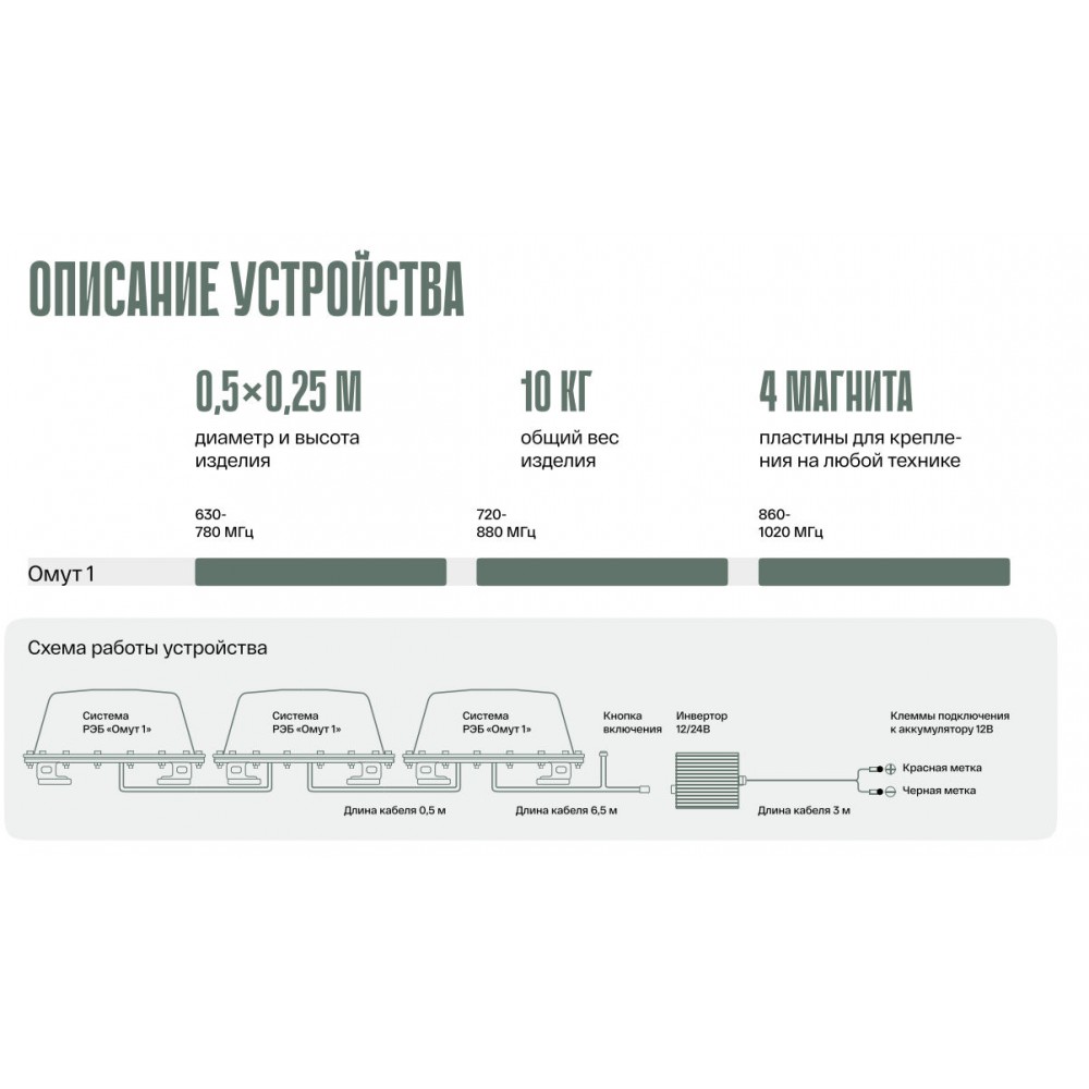 Система радиоэлектронной борьбы (РЭБ) «ОМУТ-1» предназначена для противодействия FPV-дронам и состоит из трех модулей, инвертора с диапазоном напряжения 12-24 В, кнопки включения с индикатором, а также трех модулей, создающих помехи мощностью по 50 Вт каждый. Она поддерживает как вертикальную, так и горизонтальную поляризацию сигнала.