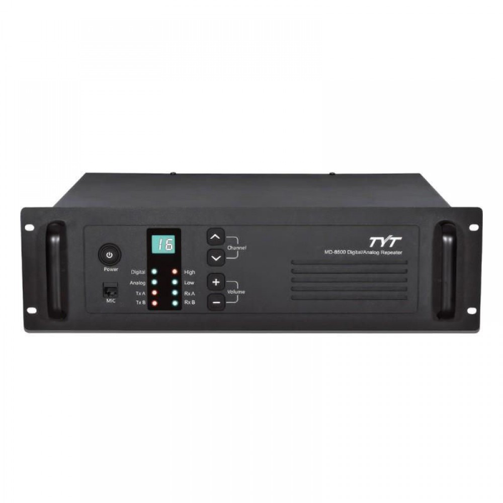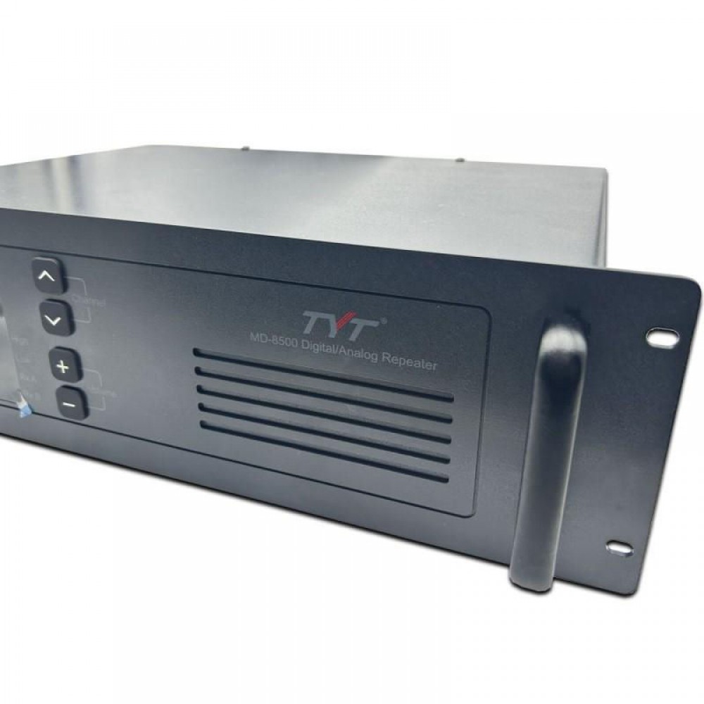 Цифровой ретранслятор стандарта DMR (ETSI) в диапазоне 400–470 МГц TYT MD-8500 значительно расширяет дальность связи между абонентскими устройствами, а также увеличивает пропускную способность системы технологической радиосвязи в два раза, обеспечивая два одновременных соединения на одном частотном канале шириной 12,5 кГц.